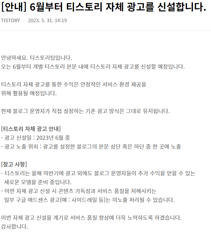 개별 블로 본문에 티스토리 자체 광고를 도입하면